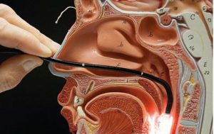 - O endoscópio é inserido cuidadosamente pela cavidade nasal mais pérvia e posicionado na garganta.